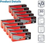 50,000 total staples, 10 boxes of 5,000-count standard metal staples with chisel point tips for easier paper penetration. 210-count strips of 26/6 (1/4″ leg) for stapling 2-30 sheets of paper.