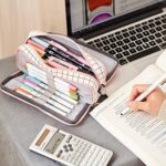 ANGOOBABY Large Pencil Case Big Capacity 3 Compartments Canvas Pencil Pouch for Teen Boys Girls School Students (Pink Strip Black Grid)