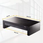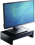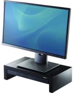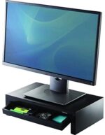 The Fellowes Designer Suites Monitor Riser features three height adjustments to prevent neck and shoulder strain! Unit raises monitor to comfortable viewing height while maximizing workspace. Supports monitors up to 21″ or 40 lbs. and offers height adjustments up to 1-5/8” (between 4-3/8” and 6”) for optimal viewing angle. Storage tray organizes essentials such as pens and paper clips. Includes non-skid rubber feet to protect work surface from scratches or scuffs.