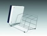 Wire catalog rack features four large compartments that are angled for improved visibility and easy retrieval.