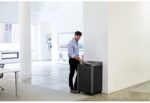 100% Jam Proof System eliminates paper jams and powers through tough jobs. Auto-Oil automatically lubricates the cutters to enhance performance and extend shredder life. Patented SafeSense Technology stops shredding when hands touch the paper opening. Energy Savings System reduces energy consumption by up to 70% compared to conventional commercial shredders during normal usage. TAA Compliant. Features extra-wide 16″ paper entry. Continuous duty motor for non-stop shredding. 2-year product and service warranty plus lifetime on cutters. 28 sheets per pass. 5/32″ x 1-1/8″ cross-cut particles (Security Level 3). 32-gallon bin. 38″H x 22″W x 20″D. For 10+ users.