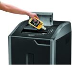 Shreds 30 sheets of paper per pass into 503 (5/32” x 1-1/8” Security Level P-4) cross-cut particles with an extra wide 12″ throat width; shreds staples, credit cards, paper clips, CDs/DVDs, junk mail