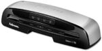 Laminator features a rapid, one-minute warm-up with instaheat technology. The 9-1/2″ entry widthmodates multiple document sizes. Saturn3i 95 laminator delivers hot lamination for 3 mil or 5 mil and coldting for self-adhesive pouches. Green light and audible beep indicate when machine is ready to laminate. Release lever disengages pouch for re-centering or removal. Auto shutoff saves energy and prevents overheating. Laminator includes a laminating starter kit. More from the manufacturer