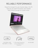 The Pale Rose Gold HP 14 Laptop is designed to keep you productive and entertained from anywhere. Maximize your viewing area and see every detail thanks to 6.5 mm micro-edge bezel display, 79% screen-to-body ratio, and 14-inch HD (1366 x 768) display (1) (2). Performance, power consumption, and value come together in the Intel® Celeron® N4020, the ideal processor for your busiest days (3). Enjoy the highest resolution games and movies with the 4K-ready Intel® UHD Graphics 600 (4) (5). Store more of what you love and multitask faster, even with multiple windows open, with this HP laptop’s 64 GB of eMMC storage and 4 GB of RAM (6). Up your creativity and efficiency as this HP 14-inch laptop offers even more features for computing from anywhere. Spend more time focused on your daily tasks and less on the battery life with up to 11 hours and 30 minutes of power (7). Plus, HP Fast Charge keeps you powered especially if you need recharge quickly (8). The exceedingly secure Windows 10 Home in S mode outfits your PC laptop with fast boot times, increased responsiveness, and added protection against phishing and malware (9). Work confidently with 1-year limited hardware warranty and stay connected with the dependable Wi-Fi 5 (1×1) and Bluetooth® 4.2 combo (10) (11). Boost your creativity as your Windows laptop comes with a 1-year subscription to Microsoft 365, including the whole Office Suite: Word, Excel, and PowerPoint (12). Productivity and entertainment features aren’t the only things your device is equipped with; lead a sustainable lifestyle with a thin laptop that is ENERGY STAR® certified and EPEAT® Silver registered (13) (14). (1) Percent of the active plus inactive viewing area to active viewing area plus border. Measure with lid vertical to the desk. (2) High-definition (HD) content is required to view high-definition images. (3) Multi-core is designed to improve the performance of certain software products. Not all customers or software applications will necessarily benefit from the use of this technology. Performance and clock frequency will vary depending on application workload and your hardware and software configurations. Intel’s numbering, branding, and/or naming is not a measurement of higher performance. Intel, Pentium, Intel Core, Celeron, Iris Xe, Intel logo, and the Intel Inside logo are trademarks of Intel Corporation in the U.S. and other countries. (4) Wireless access point and internet service required and sold separately. The availability of public wireless access points is limited. (5) Graphics output may be limited based on the maximum resolution of the display. Shared video memory (UMA) uses part of the total system memory for video performance. System memory dedicated to video performance is not available for other use by other programs. (6) For storage drives, GB = 1 billion bytes. The actual formatted capacity is less. Up to 5.1GB of disk is reserved for system recovery software. (7) Battery life tested by HP using continuous FHD video playback, 1080p (1920×1080) resolution, 150 nits brightness, system audio level at 17%, player audio level at 100%, played full-screen from local storage, headphone attached, wireless on but not connected. Actual battery life will vary depending on configuration and maximum capacity will naturally decrease with time and usage. (8) Features may require software or other 3rd party applications to provide the described functionality. Internet service required and not included. (9) Not all features are available in all editions or versions of Windows. Systems may require upgraded and/or separately purchased hardware, drivers, software, or BIOS update to take full advantage of Windows functionality. Windows 10 is automatically updated, which is always enabled. ISP fees may apply and additional requirements may apply over time for updates. See microsoft.com. Windows 10 Home (S mode) works exclusively with apps from the Microsoft Store within Windows. Certain default settings, features, and apps cannot be changed. Some accessories and apps compatible with Windows 10 may not work (including some antivirus, PDF Writers, driver utilities, and accessibility apps) and performance may vary, even if you switch to Windows 10 Home configuration (fee may apply). You can’t switch back to Windows 10 Home (S mode). Learn more at Windows.com/Windows10SFAQ. (10) Wireless access point and internet service required and sold separately. The availability of public wireless access points is limited. Wi-Fi 5 (802.11ac) is backward compatible with prior Wi-Fi 5 specs. (11) Bluetooth® is a trademark owned by its proprietor and used by Hewlett-Packard Company under license. (12) Microsoft 365 Personal 1-year subscription included. Activation is required within 6-months of the Windows activation date. Microsoft 365 Family and Microsoft 365 Personal have non-commercial rights and are meant for personal use only. See microsoft.com for full details. (13) ENERGY STAR and the ENERGY STAR mark are registered trademarks owned by the U.S. Environmental Protection Agency. (14) Based on U.S. EPEAT® registration according to IEEE 1680.1-2018 EPEAT®. EPEAT® status varies by country. Visit www.epeat.net for more information